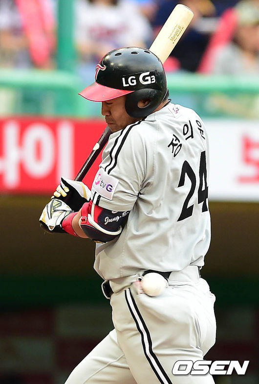 28일 오후 인천 문학구장에서 열린 '2014 한국야쿠르트 세븐 프로야구' SK 와이번스와 LG 트윈스의 경기 4회초 1사 1루 정의윤이 고효준의 투구에 몸을 맞고 있다.