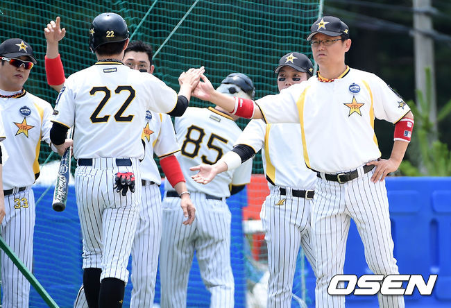 1회말 2사 1루에서 Rockstar 최원진의 선제 적시타때 홈을 밟은 1루주자 홍대건이 동료들과 환호하고 있다.