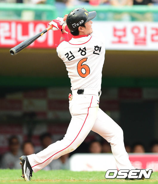 28일 오후 인천 문학구장에서 열린 '2014 한국야쿠르트 세븐 프로야구' SK 와이번스와 LG 트윈스의 경기 5회말 1사 2,3루 김성현이 2타점 2루타를 치고 있다.