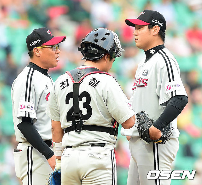 28일 오후 인천 문학구장에서 열린 '2014 한국야쿠르트 세븐 프로야구' SK 와이번스와 LG 트윈스의 경기 5회말 1사 2,3루 류제국이 강상수 코치와 이야기를 나누고 있다.