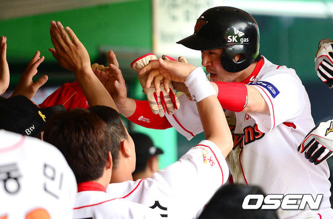 28일 오후 인천 문학구장에서 열린 '2014 한국야쿠르트 세븐 프로야구' SK 와이번스와 LG 트윈스의 경기 5회말 2사 1,2루 박정권의 2타점 2루타에 득점한 2루주자 김성현이 덕아웃에서 동료들과 하이파이브를 하고 있다.