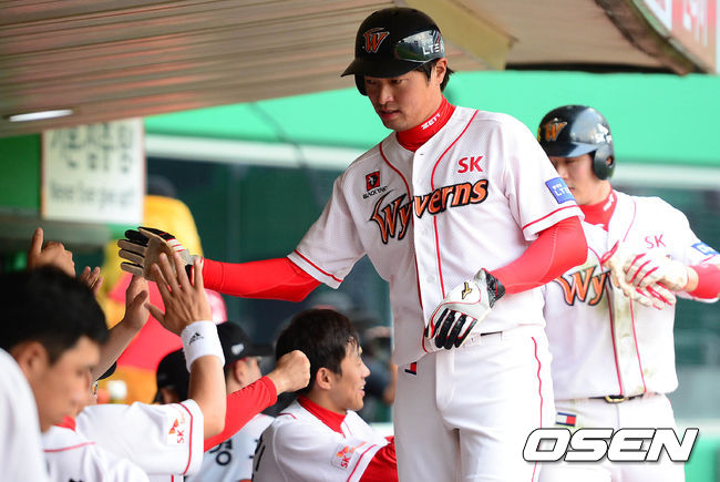 28일 오후 인천 문학구장에서 열린 '2014 한국야쿠르트 세븐 프로야구' SK 와이번스와 LG 트윈스의 경기 5회말 2사 1,2루 박정권의 2타점 2루타에 득점한 1루주자 임훈이 덕아웃에서 동료들과 하이파이브를 하고 있다.