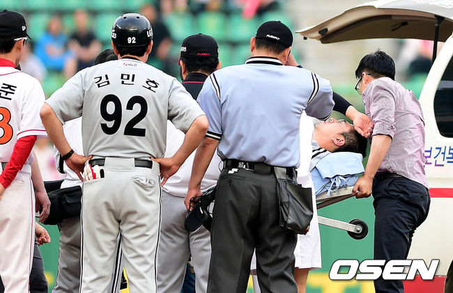 28일 오후 인천 문학구장에서 열린 '2014 한국야쿠르트 세븐 프로야구' SK 와이번스와 LG 트윈스의 경기 6회초 무사 1,2루 이진영의 1루수앞 땅볼상황, 1루수 한동민의 2루송구에 얼굴을 맞은 정성훈이 구급차에 실려 나가고 있다.