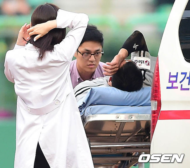 송구 머리 강타 후 구급차에 실려 나가는 정성훈