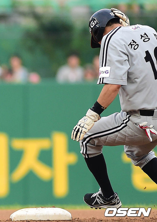 28일 오후 인천 문학구장에서 열린 '2014 한국야쿠르트 세븐 프로야구' SK 와이번스와 LG 트윈스의 경기 6회초 무사 1,2루 이진영의 1루수앞 땅볼상황, 1루수 한동민의 2루송구에 머리를 맞은 정성훈이 고통을 호소하며 쓰러지고 있다.