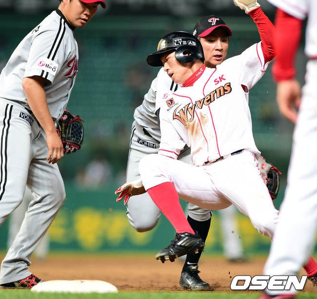 28일 오후 인천 문학구장에서 열린 '2014 한국야쿠르트 세븐 프로야구' SK 와이번스와 LG 트윈스의 경기 8회말 무사 1루 한동민 타석, 1루주자 김재현이 협살에 걸려 오지환에게 태그 당하고 있다.