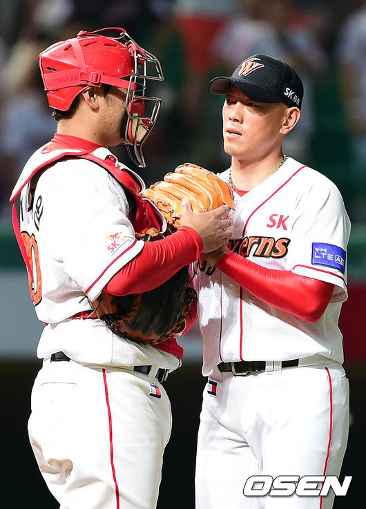 28일 오후 인천 문학구장에서 열린 '2014 한국야쿠르트 세븐 프로야구' SK 와이번스와 LG 트윈스의 경기 9회초 박정배의 투구가 선두타자 손주인의 몸에 맞자 박정배가 홈플레이트로 다가와 이재원과 이야기를 하고 있다.