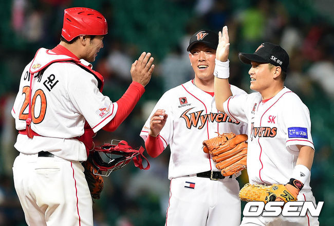 28일 오후 인천 문학구장에서 열린 '2014 한국야쿠르트 세븐 프로야구' SK 와이번스와 LG 트윈스의 경기 종료 후 이재원, 박정배, 이대수가 하이파이브를 하고 있다.