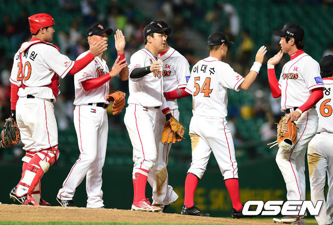 28일 오후 인천 문학구장에서 열린 '2014 한국야쿠르트 세븐 프로야구' SK 와이번스와 LG 트윈스의 경기 종료 후 SK 선수들이 하이파이브를 하고 있다.