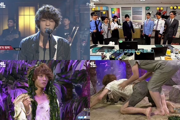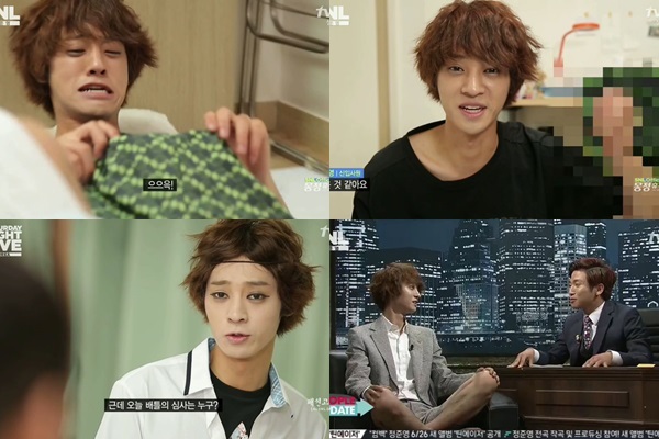 지난 28일 방송 역시 그랬다. 이날 콩트는 '똘끼 충만한' 메인호스트 정준영의 매력에만 기댄 듯 했다. 정준영의 활약은 또래 스타들에 비해 확실히 수위도 세고 화끈하긴 했다. 그는 짙은 아이라인으로 일부 '패션피플'들을 패러디하고, 미역을 머리에 감고 묘한 자세를 취하는가 하면 몸에 딱달라붙는 옷을 입고 등장해 눈길을 모았다. 몽정 휴가를 다룬 콩트에서는 모자이크 처리가 필요한 포즈도 서슴없이 소화했다.