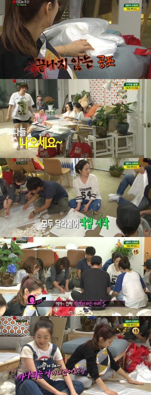 28일 오후 방송된 KBS 2TV 예능프로그램 '인간의 조건'에서는 박은영이 가져온 비닐 접기 부업을 아직 다 끝내지 못해 멤버들과 스태프들에게 도움을 요청했다. 결국 제작진까지 동원 돼 한 마음으로 부업에 나섰다.