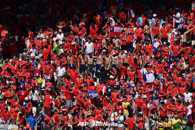 [OSEN=사진팀]29일(한국시각) 브라질 벨루오리존치에 위치한 에스타디오 미네이랑에서 열린 2014 브라질월드컵 16강전 첫 경기 브라질과 칠레의 경기전 칠레 축구팬들이 열띤 응원을 펼치고 있다.