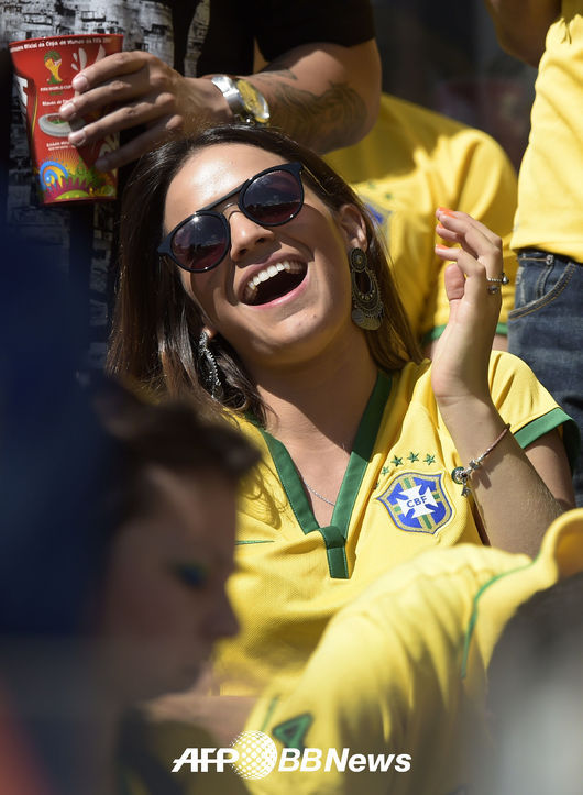 [OSEN=사진팀]29일(한국시각) 브라질 벨루오리존치에 위치한 에스타디오 미네이랑에서 열린 2014 브라질월드컵 16강전 첫 경기 브라질과 칠레의 경기전 네이마르의 여자친구 브루나 마르케지니가 열띤 응원을 펼치고 있다. 브루나 마르케지니는 모델이자 배우로 활동중이다.