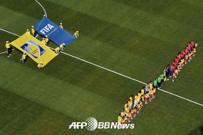 [OSEN=사진팀]29일(한국시각) 브라질 벨루오리존치에 위치한 에스타디오 미네이랑에서 열린 2014 브라질월드컵 16강전 첫 경기 브라질과 칠레의 경기전 양팀 선수들이 식전행사를 하고 있다.