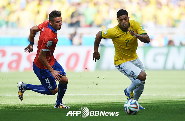 [OSEN=사진팀]29일(한국시각) 브라질 벨루오리존치에 위치한 에스타디오 미네이랑에서 열린 2014 브라질월드컵 16강전 첫 경기 브라질과 칠레의 경기, 전반 브라질 헐크가 드리블을 하고 있다