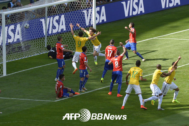 [OSEN=사진팀]29일(한국시각) 브라질 벨루오리존치에 위치한 에스타디오 미네이랑에서 열린 2014 브라질월드컵 16강전 첫 경기 브라질과 칠레의 경기, 전반 브라질 다비드 루이스가 선취골을 넣고 환호하고 있다