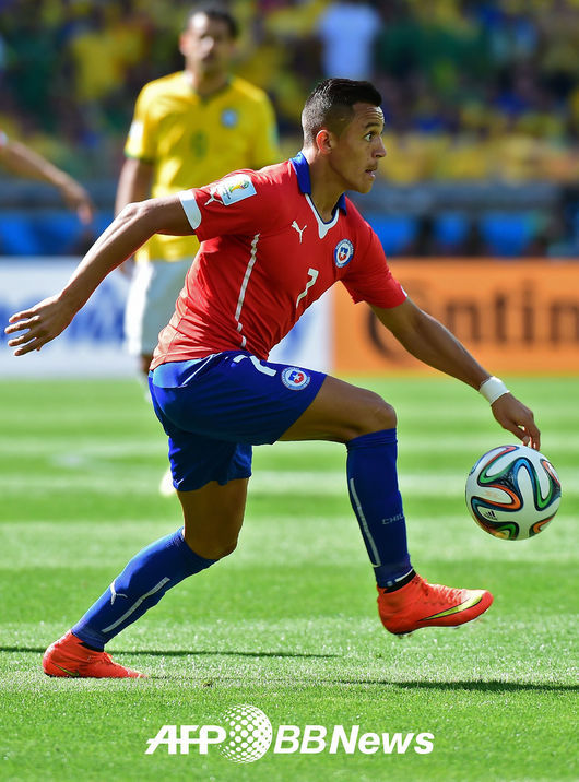 [OSEN=사진팀]29일(한국시각) 브라질 벨루오리존치에 위치한 에스타디오 미네이랑에서 열린 2014 브라질월드컵 16강전 첫 경기 브라질과 칠레의 경기, 전반 칠레 산체스가 드리블을 하고 있다