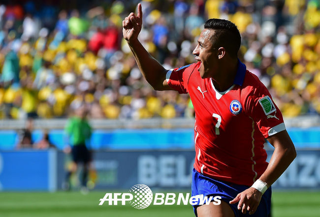 [OSEN=사진팀]29일(한국시각) 브라질 벨루오리존치에 위치한 에스타디오 미네이랑에서 열린 2014 브라질월드컵 16강전 첫 경기 브라질과 칠레의 경기, 전반 칠레 산체스가 동점골을 넣고 환호하고 있다.
