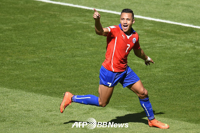 C[OSEN=사진팀]29일(한국시각) 브라질 벨루오리존치에 위치한 에스타디오 미네이랑에서 열린 2014 브라질월드컵 16강전 첫 경기 브라질과 칠레의 경기, 전반 칠레 산체스가 동점골을 넣고 환호하고 있다.