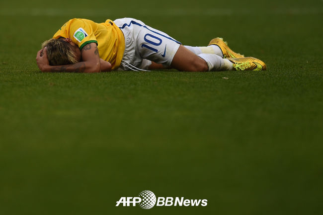 [OSEN=사진팀]29일(한국시각) 브라질 벨루오리존치에 위치한 에스타디오 미네이랑에서 열린 2014 브라질월드컵 16강전 첫 경기 브라질과 칠레의 경기, 후반 브라질 네이마르가 떨어진 후 고통스러워하고 있다.