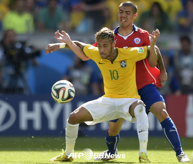 [OSEN=사진팀]29일(한국시각) 브라질 벨루오리존치에 위치한 에스타디오 미네이랑에서 열린 2014 브라질월드컵 16강전 첫 경기 브라질과 칠레의 경기, 후반 브라질 네이마르가 칠레 실바의 수비에 막혀 고전하고 있다.