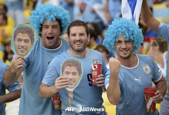 [OSEN=사진팀]29일 오전(한국시간) 2014 브라질 월드컵 16강전 콜롬비아와 우루과이의 경기에 앞서 우루과이 축구팬이 열띤 응원을 펼치고 있다.