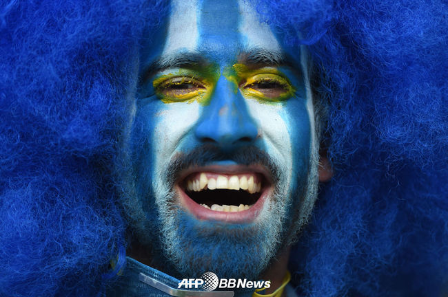 우루과이 축구팬이 화려한 페이스페인팅한 채 응원을 펼치고 있다. /photo@osen.co.kr