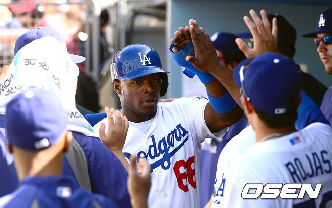 1회말 1사 1,2루 다저스 푸이그가 곤잘레스의 내야 땅볼때 세인트루이스 유격수 데스칼소의 실책으로 득점을 올린 뒤 기뻐하고 있다.