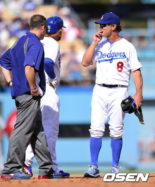 2회말 무사 1루 다저스 돈 매팅리 감독이 1타점 적시 2루타를 때린 뒤 통증을 호소하는 터너를 바라보며 아쉬워하고 있다.
