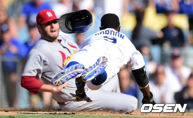 2회말 1사 1,2루 다저스 디 고든이 세인트루이스 랜스 린의 폭투를 틈타 홈까지 쇄도하다 아웃당하고 있다.