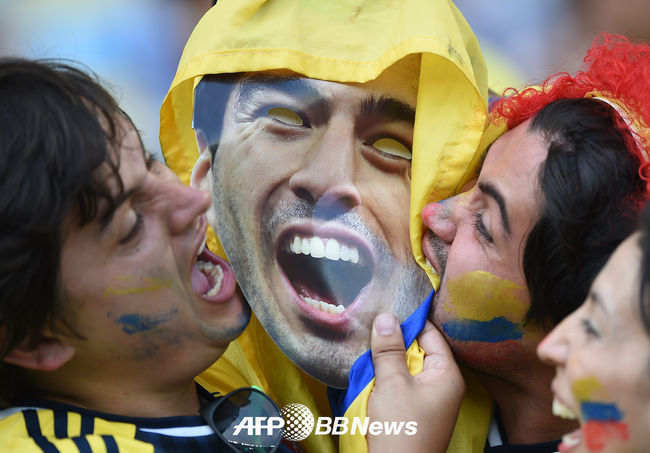 콜롬비아 축구팬들이 우루과이 수아레스의 핵이빨 패러디를 보이고 있다.. /photo@osen.co.kr