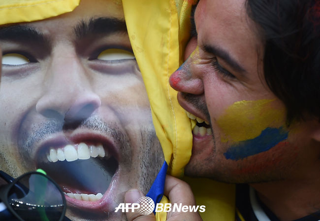 콜롬비아 축구팬들이 우루과이 수아레스의 핵이빨 패러디를 보이고 있다.. /photo@osen.co.kr