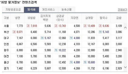 전국 외식비 비교표가 공개됐다. 서울에서 외식 한 번 하기가 쉽지 않은 것으로 드러났다.