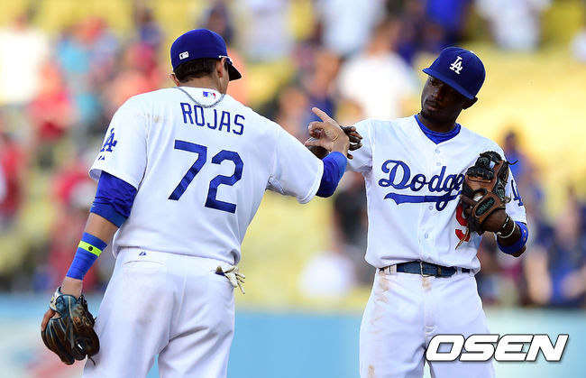 승리를 거둔 다저스 로하스와 고든이 하이파이브를 하고 있다./youngrae@osen.co.kr