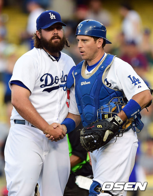 승리를 거둔 다저스 크리스 페레즈와 A.J 엘리스가 악수를 나누고 있다./youngrae@osen.co.kr
