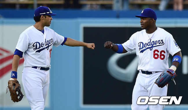 승리를 거둔 다저스 이디어와 푸이그가 하이파이브를 하고 있다./youngrae@osen.co.kr
