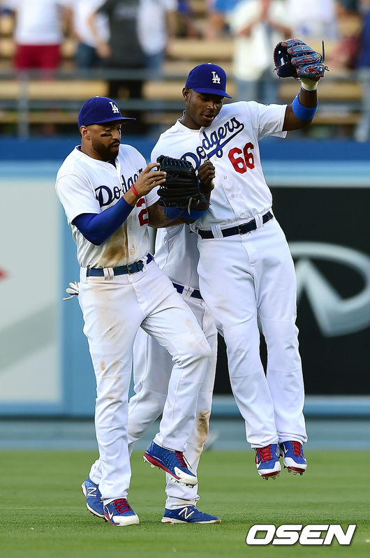 승리를 거둔 다저스 켐프, 이디어, 푸이그가 세레머니를 하고 있다./youngrae@osen.co.kr