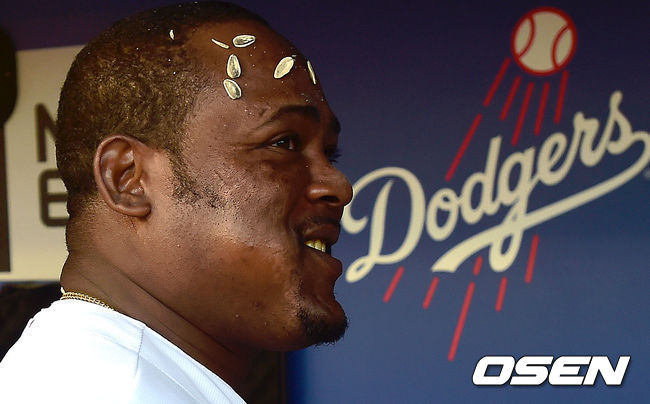 다저스 류현진과 푸이그가 유리베 헬멧에 해바라기씨를 넣어 두었다가 유리베의 머리에 쓰게 했다./youngrae@osen.co.kr