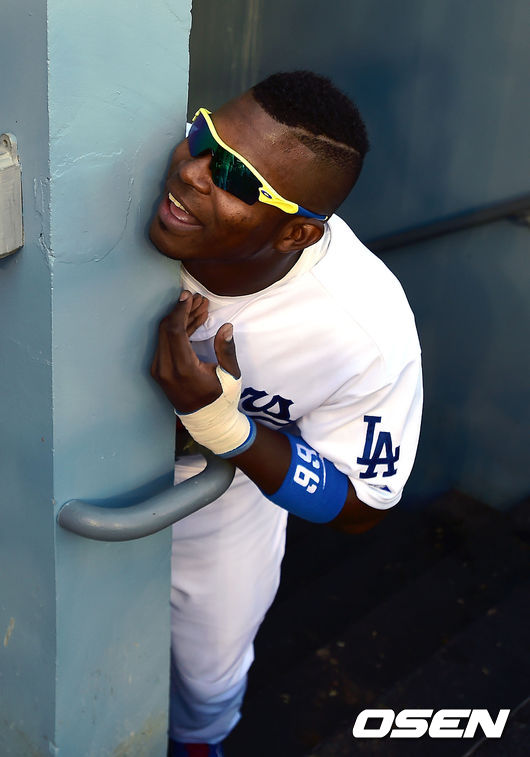 다저스 푸이그가 유리베 헬멧에 해바라기씨를 넣어 두었다가 유리베의 머리에 쓰게 했다./youngrae@osen.co.kr