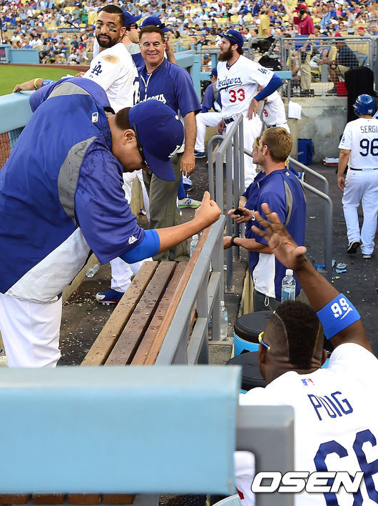 다저스 류현진과 푸이그가 유리베 헬멧에 해바라기씨를 넣어 두었다가 유리베의에게 장난을 친 뒤 즐거워하고 있다./youngrae@osen.co.kr