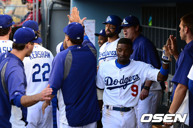 8회말 1사 만루 다저스 고든과 로빈슨이 유리베의 안타로 득점을 올린 뒤 기뻐하고 있다./youngrae@osen.co.kr