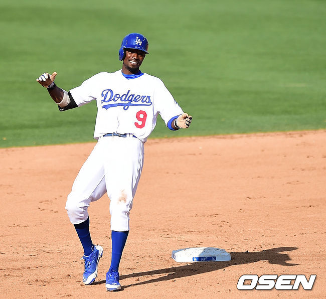 3회말 1사 1루 다저스 디 고든이 2루타를 때린 뒤 기뻐하고 있다./youngrae@osen.co.kr