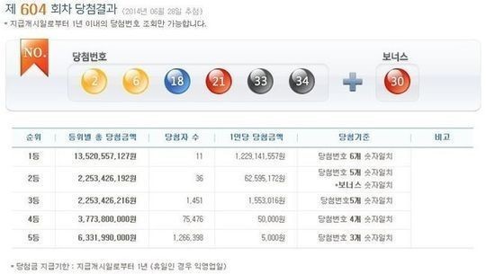14일 추첨한 로또 제 602회 나눔로또 당첨번호는 1등 당첨번호는 '2, 6, 18, 21, 33, 34'로 결정됐다. 2등 보너스 번호는 '30'.