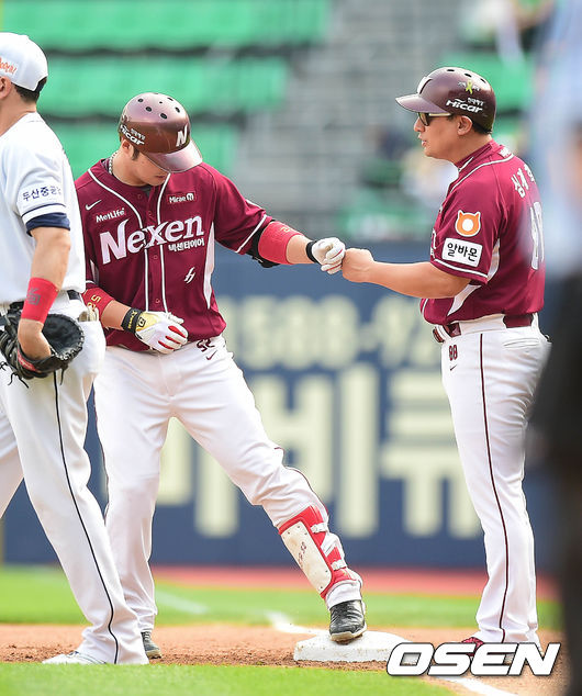 1회초 넥센 공격 2사 3루 상황 박병호가 선제 1타점 좌전안타를 날리고 1루에 안착해 심재학 코치와 인사를 나누고 있다.