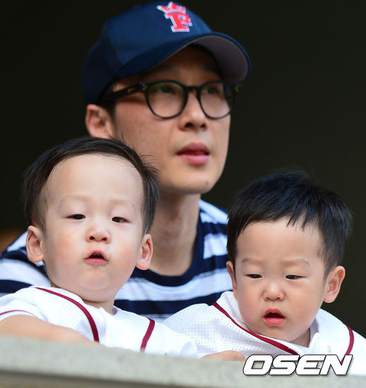 야구장을 찾은 방송인 이휘재와 쌍둥이 아들 서언-서준이 경기를 관람하고 있다.