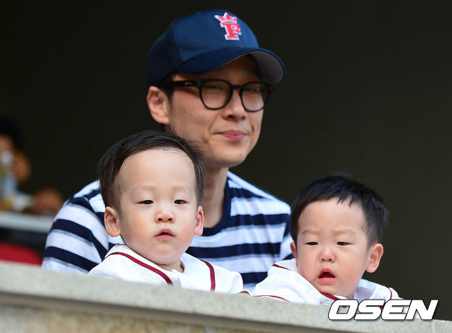 야구장을 찾은 방송인 이휘재와 쌍둥이 아들 서언-서준이 경기를 관람하고 있다.