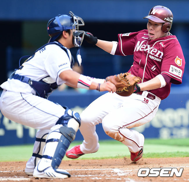 4회초 넥센 공격 무사 3루 상황 김민성의 중견수 희생플라이 때 주자 강정호가 태그업해 홈으로 내달려 세이프되고 있다.