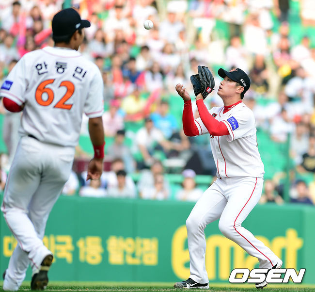 29일 오후 인천 문학구장에서 열린 '2014 한국야쿠르트 세븐 프로야구' SK 와이번스와 LG 트윈스의 경기 3회초 무사 1,2루 임재철의 번트 뜬공을 여건욱이 잡고 있다.