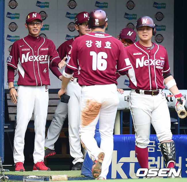 4회초 넥센 공격 무사 3루 상황 김민성의 중견수 희생플라이 때 주자 강정호가 태그업해 홈으로 내달려 세이프된 뒤 염경엽 감독과 인사를 나누고 있다.