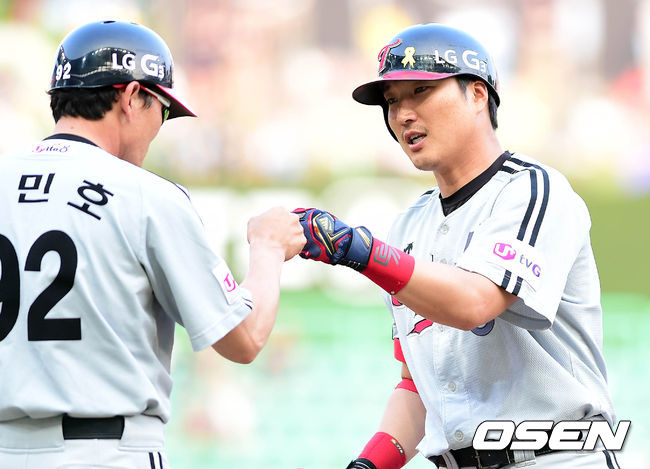 29일 오후 인천 문학구장에서 열린 '2014 한국야쿠르트 세븐 프로야구' SK 와이번스와 LG 트윈스의 경기 5회초 1사 1,2루 이진영이 1타점 적시타를 치고 김민호 코치와 하이파이브를 하고 있다.
